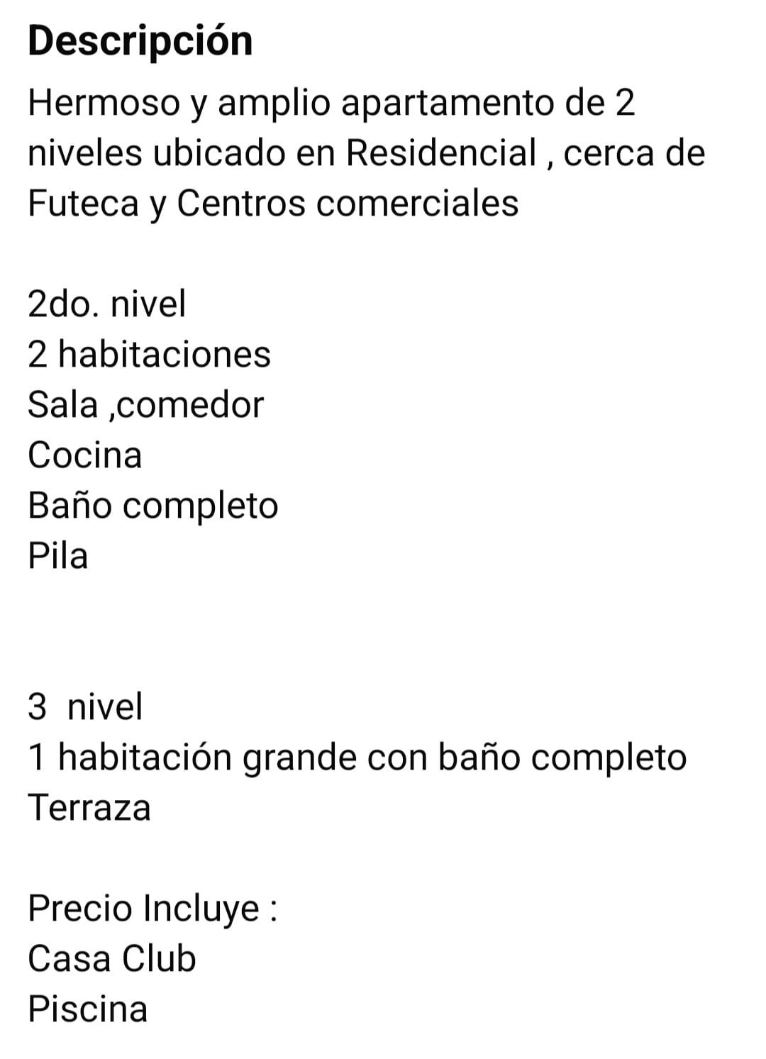 Apartamento en renta Ubicada en Cañada del rio, Zona 13 San Miguel Petapa Renta Q2,500.00Cerca del Futeca y Centros ComercialesPrecio Incluye: Casa Club y PiscinaCitas con 3 horas de anticipación Quiero hacer una cita CaracterísticasSegundo NivelN2 habitacionesNSala, comedorNCocinaNBaño completoNPilaTercer NivelN1 habitación grande con baño completoNTerrazaVendemos y Alquilamos
