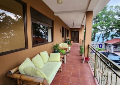 Sala principal con chimenea y balcón grande con vista al a ciudad