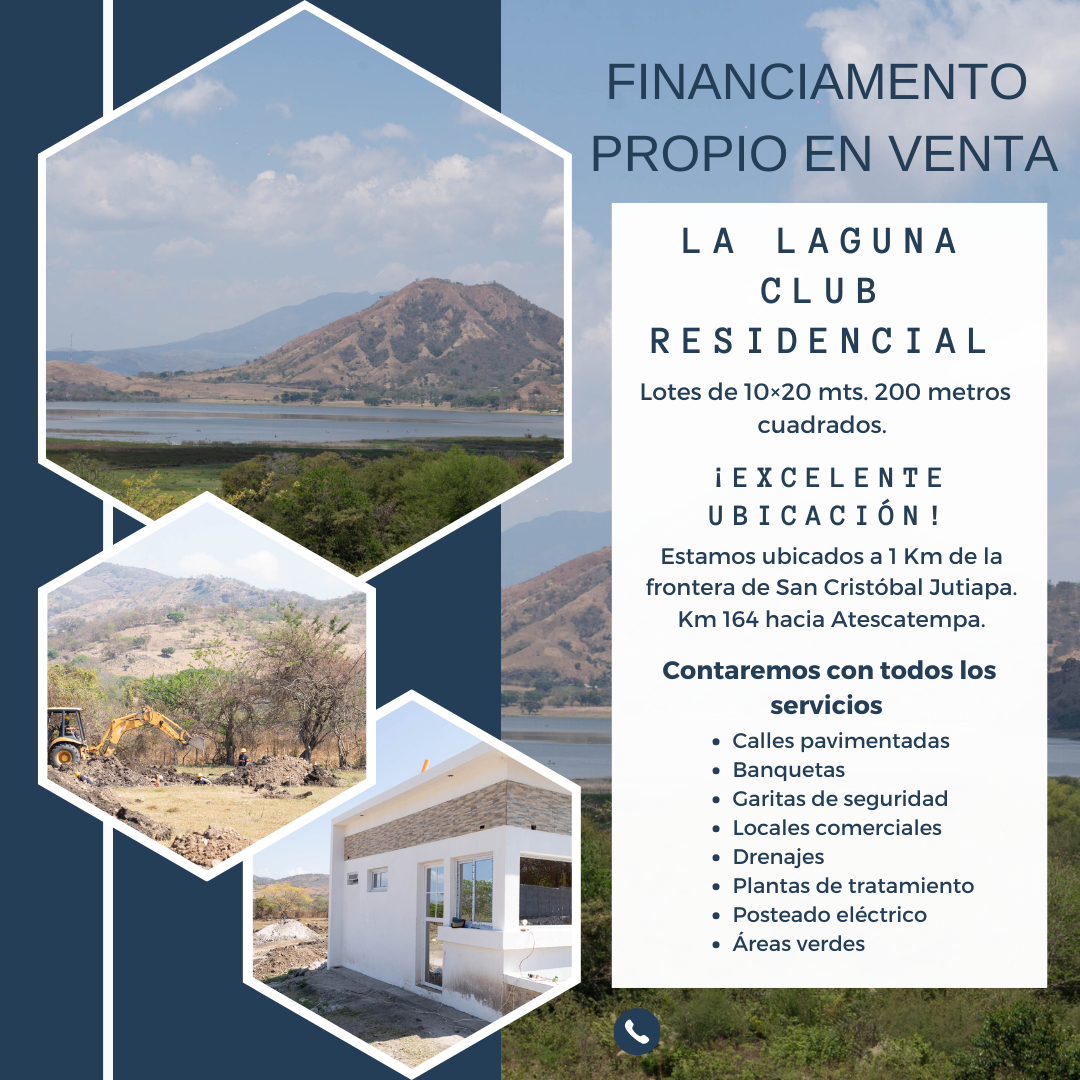 La Laguna Club Residencial te ofrece lotes de 10×20 mts. Con 200 metros cuadrados. Ubicados a 1 Km de la frontera de San Cristóbal Jutiapa. Km 164 hacia Atescatempa.